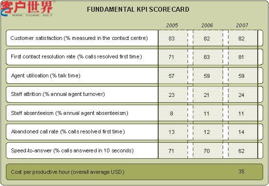 呼叫中心理論、實踐和投資三者相結(jié)合就會實現(xiàn)生產(chǎn)效率、生產(chǎn)效能、生產(chǎn)力和銷售業(yè)績的結(jié)合。2007計分卡顯示客戶滿意度得分很低。我們認為呼叫中心必須采取一種正確的方式來理解此項活動的真正的價值,以便更準確地估測和報道客戶滿意度。
