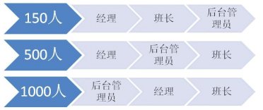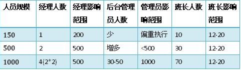 當(dāng)員工人數(shù)到達(dá)500人的時(shí)候,班長(zhǎng)往往有30位左右。很多經(jīng)理已經(jīng)不能夠?qū)γ课话嚅L(zhǎng)有足夠的了解,更不要說去認(rèn)識(shí)大部分員工。這個(gè)時(shí)候,經(jīng)理對(duì)班長(zhǎng)的比例過寬,需要強(qiáng)化后臺(tái)管理員的角色。比如排班、績(jī)效、質(zhì)量管理(而不僅是評(píng)估)、信息分析(數(shù)據(jù)和報(bào)告)、行政、培訓(xùn)等工作中,這些管理輔助角色都在逐漸強(qiáng)化。而每一個(gè)后臺(tái)管理者可能成了經(jīng)理的直接下屬,他們起草的流程和制度,來由經(jīng)理決策。某種程度上說,他們比班長(zhǎng)的影響力更大,因?yàn)榘嚅L(zhǎng)還是影響著12-20人。有時(shí)候后臺(tái)管理員也決定了班長(zhǎng)的時(shí)間精力分配,那是班長(zhǎng)最寶貴的資源。那么誰(shuí)是管理者呢?首先是經(jīng)理,其次是后臺(tái)管理員,最后才是班長(zhǎng)。