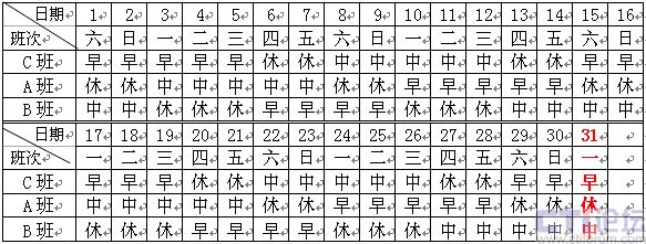 1)正常日班人員:主要的工作時(shí)間是8:00~16:00,該班組人員是固定在這一時(shí)間段內(nèi)工作,不另作安排。