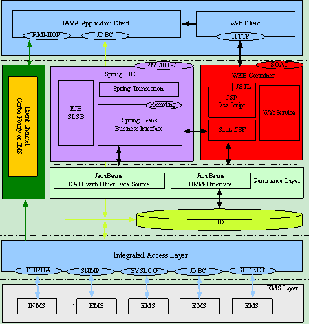 展現(xiàn)層分為兩類(lèi)用戶(hù)界面,一種是Java Application類(lèi)胖用戶(hù)界面;另外一種是純HTTP Web瘦客戶(hù)界面。Java Application頁(yè)面用于實(shí)現(xiàn)拓?fù)涔芾淼痊F(xiàn)階段不易于采用Web技術(shù)實(shí)現(xiàn)的交互頁(yè)面,與其他各層的交互協(xié)議主要采用RMI-IIOP或JDBC。