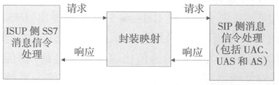 由于ISUP同SIP采用不同的消息封裝機(jī)制,ISUP采用的是二進(jìn)制編碼,而SIP采用文本編碼方式。因此,MGC收到ISUP消息后通過(guò)ISUP-MIME方式把ISUP消息內(nèi)容封裝在SIP消息體中,傳送到SIP接收端MGC再把所需內(nèi)容提取出來(lái),從而完成對(duì)ISUP消息的透明傳送,實(shí)現(xiàn)IP網(wǎng)同PSTN網(wǎng)絡(luò)的無(wú)縫連接。具體過(guò)程見(jiàn)圖。