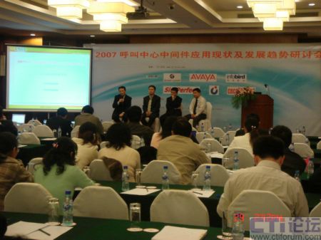 2007年11月29日,由CTI論壇主辦的,2007呼叫中心中間件應(yīng)用現(xiàn)狀及發(fā)展趨勢(shì)研討會(huì)在上海光大會(huì)展中心國(guó)際大酒店隆重召開,會(huì)議期間,來(lái)自于當(dāng)前各主流中間件廠商的專家在臺(tái)上回答參會(huì)代表的提問,與代表互動(dòng)交流,并就熱點(diǎn)問題各抒己見,共同探討。