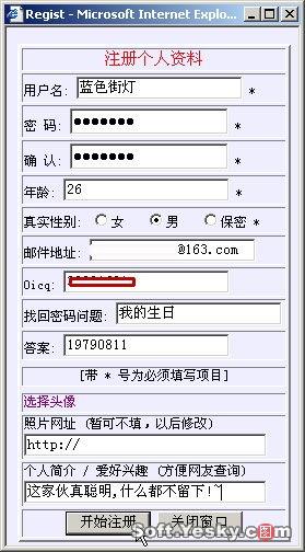 單擊首頁(yè)中的“用戶(hù)注冊(cè)”,然后在彈出的用戶(hù)注冊(cè)頁(yè)面中輸入用戶(hù)名、密碼、性別等信息(如圖24所示),單擊“開(kāi)始注冊(cè)”即告完成。