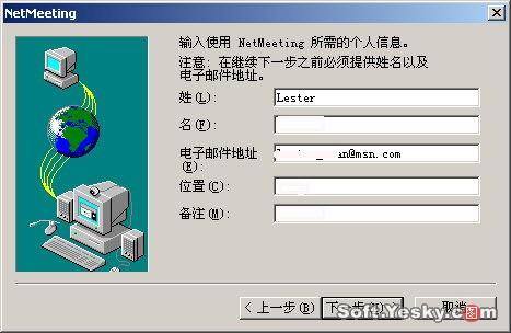 首次運(yùn)行Netmeeting,軟件會(huì)出現(xiàn)一個(gè)向?qū),要求?duì)用戶(hù)信息進(jìn)行簡(jiǎn)單的設(shè)定,單擊下一步,輸入個(gè)人信息,如圖4所示: