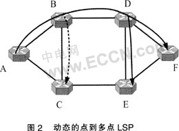 ....用圖2所示的6節(jié)點光網(wǎng)絡來闡述整個組播信令流程。與IP組播不同,點到多點LSP并不需要額外的組播組管理協(xié)議。這是因為葉子節(jié)點的地址直接被包括在請求中,而不像IP組播中僅僅只是使用一個D類地址。所有的組播樹請求都將用一個三元組來表示{T,a,L},其中T是組播樹的標識符,s是源節(jié)點,L是組播樹的葉子集合。當T等于O的時候意味著這是一個組播樹建立請求。例如,源節(jié)點A希望建立一個到葉子E和F的組播樹,那么這個請求就被表示為{0,A,{E,F(xiàn)}}。當這顆樹被建立后,它將被分配一個全局唯一的標識符,比如1。請求{1,A,{C1}}和{1,A,{F}}則分別意味著將葉子C嫁接到組播樹1和將葉子F從組播樹1中剪除。如果想刪除整棵樹,只需要將組播樹1的所有葉子都剪除即可,即{1,A,{C,E}}。