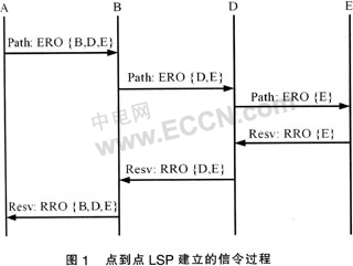 Switching Path)建立的信令過程。當入口標記交換路由器(LSR:Label Switching Router)A接收到一個業(yè)務請求后,它根據(jù)路由控制模塊計算出來的路由填寫顯示路由對象(ERO:Explicit
