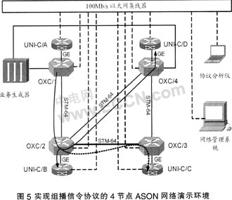....圖5顯示了一個用來實現(xiàn)組播信令協(xié)議的4節(jié)點ASON網(wǎng)絡演示環(huán)境。圖中OXC的核心交換矩陣是基于時分交換,交換粒度為一個SDH