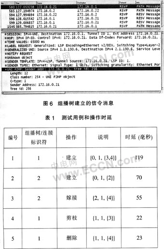 1出發(fā)的組播樹和單播連接,結(jié)果如表1所列。圖6顯示了Ethereal捕獲的組播樹建立的信令消息。在解開的Path消息中,可以發(fā)現(xiàn)經(jīng)過擴展的UNI組播對象。然后,對已存在的連接進行了動態(tài)的修改。在第三個測例中,一個葉子被添加到單播連接上并使其變?yōu)橐豢媒M播樹。在嫁接和剪枝的操作中,業(yè)務生成器在已建立的連接上沒有觀察到丟包的現(xiàn)象。