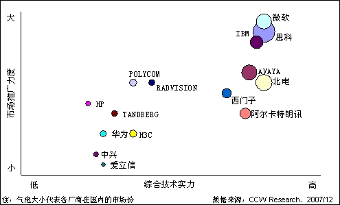 市場競爭非常激烈,但還沒有一個廠商占據(jù)對優(yōu)勢。目前統(tǒng)一通信市場形成了兩類供應(yīng)商的競爭:電信網(wǎng)絡(luò)設(shè)備廠商(如思科、北電)和軟件廠商(如微軟、IBM)。電信設(shè)備廠商的優(yōu)勢集中在硬件產(chǎn)品上,比如路由器、VoIP網(wǎng)關(guān)產(chǎn)品、軟交換設(shè)備;而軟件廠商,像微軟、IBM的優(yōu)勢在于其在電腦桌面上的絕對統(tǒng)治力,幾乎所有的統(tǒng)一通信企業(yè)都需要和微軟、IBM進行合作。但從現(xiàn)在的發(fā)展狀況來看,各類廠商之間既有競爭又有合作,但還沒有一個廠商占據(jù)對優(yōu)勢。