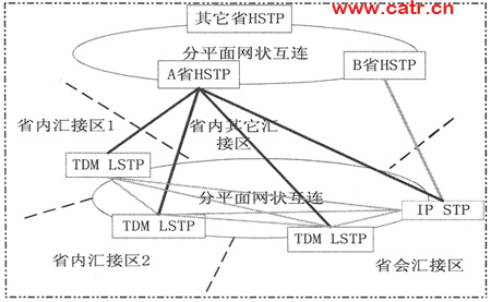 IP STP與現(xiàn)有省內(nèi)的TDM STP分別開(kāi)通B鏈路(TDM),與1對(duì)省際HSTP開(kāi)通D鏈路(TDM)。