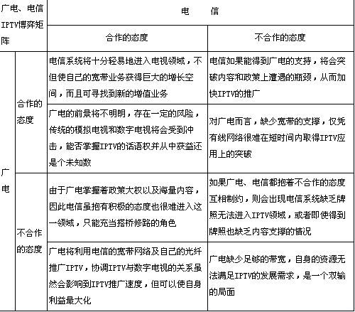 電信、廣電雖然都想爭奪IPTV的主導地位,但通過博弈矩陣可以看出,電信和廣電的互相滲透將是打造成熟的IPTV產(chǎn)業(yè)鏈的必然。廣電運營商具有內(nèi)容優(yōu)勢,電信運營商擁有交互技術和網(wǎng)絡。廣電網(wǎng)絡的條塊分割決定了廣電運營商豐富的內(nèi)容資源一旦脫離了電信的IP網(wǎng)絡,就很難抓住IPTV的機會;而電信運營商的網(wǎng)絡資源沒有內(nèi)容,也會遭遇發(fā)展瓶頸,惟有廣電和電信合作競爭才是IPTV產(chǎn)業(yè)走向健康發(fā)展的現(xiàn)實選擇。