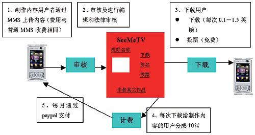 M1新加坡移動運營商M1推出了用戶制作及共享視頻業(yè)務——MeTV,用戶可以通過MMS上傳視頻內(nèi)容,其它用戶可以瀏覽并下載。這項業(yè)務為用戶提供了一個展示自己和了解他人的平臺。這個業(yè)務也建立了與用戶分成的模式,用戶可以從自己上傳的內(nèi)容中獲得利潤。用戶上傳的視頻內(nèi)容,被他人下載一次,用戶就可以獲得0.05新元。自從2007年3月該業(yè)務推出以來,已經(jīng)有超過4萬名用戶,收入最高的用戶已經(jīng)達到50~100新元。