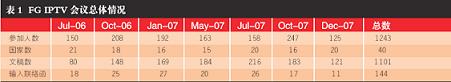 FGIPTV在一年半的時(shí)間里共召開了7次會(huì)議,收到了1101篇文稿,參加者包括來(lái)自40個(gè)國(guó)家的1243名專家(見表1),其中既包括傳統(tǒng)電信網(wǎng)的專家,也包括來(lái)自廣播電視行業(yè)、IT業(yè)的專家,通過(guò)這7次會(huì)議、提交的文稿以及專家們的貢獻(xiàn),一方面產(chǎn)生了IPTV的定義,另一方面也形成了21個(gè)工作文檔,并根據(jù)這些文檔的內(nèi)容確定了負(fù)責(zé)此文檔的相應(yīng)研究組和課題(即Q/SG),詳見表2。