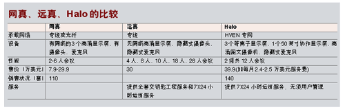 惠普的Halo工作室系統(tǒng)強(qiáng)調(diào)可用于企業(yè)遠(yuǎn)程模擬面對面業(yè)務(wù)會議。通過Halo連接,每個Halo工作室可支持會議桌前排六人,第二排三至六人,最多12人的會議規(guī)模。每個工作室有三臺等離子顯示器,參會人員能夠看到與本人同樣大小的圖像。另外,參會者還可使用一個安裝在等離子顯示器上方的50英寸的協(xié)作屏幕,與其他Halo工作室中的人員共享其筆記本電腦中的文件與數(shù)據(jù)。工作室還包括一個高清圖文攝像機(jī),可用于拍攝桌上的物品并顯示在協(xié)作顯示器上,真實(shí)呈現(xiàn)色彩、陰影與細(xì)微之處。同時配備的電話讓與會者可以與Halo工作室外的人員聯(lián)系。工作室配備了廣播質(zhì)量的音頻與照明設(shè)施,參會者可以使用屏幕上簡便的用戶界面,通過點(diǎn)擊鼠標(biāo)開始協(xié)作。一個復(fù)雜的軟件控制系統(tǒng)將確保各個Halo工作室輕松、無縫地協(xié)同工作。