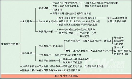 在給某移動(dòng)運(yùn)營商進(jìn)行的接通率優(yōu)化咨詢項(xiàng)目中,利用呼叫中心接通率優(yōu)化模型進(jìn)行了分析,圖2是針對(duì)分流呼叫中心總體呼叫量所提出的建議措施。