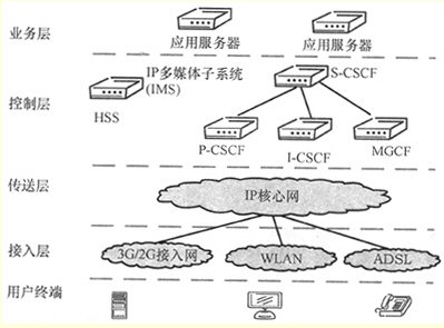 IMS使用會(huì)話發(fā)起協(xié)議(SIP)作為建立、控制、修改和終止兩個(gè)或者更多個(gè)參與者之間的語音、視頻和消息等會(huì)話的信令協(xié)議。在IMS中,與SIP相關(guān)的信令點(diǎn)稱為呼叫狀態(tài)控制功能信令點(diǎn),并且根據(jù)它們功能的不同而有所區(qū)分。IMS中與鑒權(quán)、授權(quán)、計(jì)費(fèi)相關(guān)的功能基于IETF、Diameter協(xié)議,是在HSS、CSCF等IMS組件上實(shí)現(xiàn)的,提供業(yè)務(wù)收費(fèi)功能。HSS是與用戶和服務(wù)相關(guān)的數(shù)據(jù)的主要存儲(chǔ)器,由2G移動(dòng)通信網(wǎng)的HLR演進(jìn)而來。業(yè)務(wù)層上的應(yīng)用服務(wù)器提供各種業(yè)務(wù)邏輯,實(shí)現(xiàn)多種電信增值業(yè)務(wù)。傳送層的IP核心網(wǎng)是IMS業(yè)務(wù)的統(tǒng)一承載網(wǎng)絡(luò)。接入層提供包括2G、3G(UMTS、cdma2000)、WLAN、ADSL等在內(nèi)的多種接入方式。