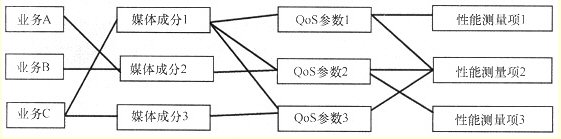 對于基于IMS的下一代網(wǎng)絡(luò)來說,QoS參數(shù)和業(yè)務(wù)的相關(guān)關(guān)系比較復(fù)雜。對于一個(gè)IMS業(yè)務(wù),需要保障其包含的所有的媒體成分的服務(wù)質(zhì)量。將IMS業(yè)務(wù)的QoS要求分解為可測量的網(wǎng)絡(luò)參數(shù)的過程如圖2所示。