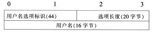 本方案采用DHCPv6協(xié)議作為接入認(rèn)證方式,在DHCPv6 Request消息中添加用戶名和密碼選項(xiàng)來傳送認(rèn)證信息。用戶名選項(xiàng)格式定義如下: