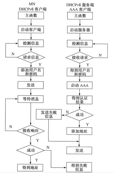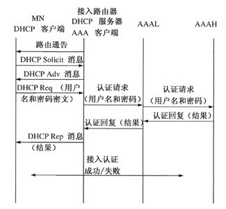 本方案認(rèn)證機(jī)制在比較上述幾種認(rèn)證機(jī)制的優(yōu)缺點(diǎn)的基礎(chǔ)上,根據(jù)層次移動(dòng)IPv6的網(wǎng)絡(luò)特性和運(yùn)行需求,采用IPv6的動(dòng)態(tài)主機(jī)配置協(xié)議(DHCPv6)結(jié)合AAA協(xié)議來完成AAA認(rèn)證和地址分配過程。該機(jī)制工作在網(wǎng)絡(luò)層,不依賴鏈路層協(xié)議,有利于移動(dòng)節(jié)點(diǎn)用多種方式接入網(wǎng)絡(luò),具有兼容性好、利于向高層協(xié)議擴(kuò)展、實(shí)現(xiàn)簡(jiǎn)單、容易控制、與移動(dòng)IP結(jié)合性好等優(yōu)點(diǎn)。