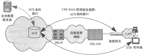 DSL Forum的終端管理模型如圖2所示,它確定了BOSS、ACS、DSLAM、家庭網(wǎng)關、終端設備的整體模型,被業(yè)界廣泛引用。