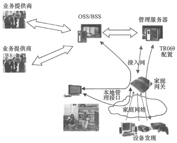 Forum的參考模型,加入了服務提供商,形成了服務提供商、BOSS、ACS、家庭網(wǎng)關、終端的整體管理架構(如圖3所示),并著重研究RMS/ACS與HG之間接口、HG與ED之間接口[6]。