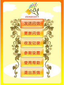 “閃信”的主操作界面設(shè)計(jì)簡潔、顏色以明快的橙色位置。功能選項(xiàng)整齊的排列在屏幕中央。功能項(xiàng)共分為6大項(xiàng)“發(fā)送閃信、收發(fā)記錄、更新閃信、參數(shù)設(shè)置、使用幫助、退出系統(tǒng)”功能項(xiàng)的設(shè)置簡潔,功能名稱使人看過之后就可以迅速理解了各個(gè)選項(xiàng)的功能重點(diǎn)。