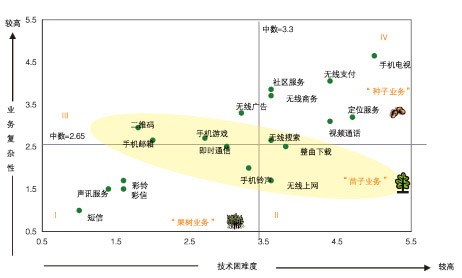 根據(jù)“業(yè)務(wù)復(fù)雜性—技術(shù)困難度”模型,可以清晰地看到一個(gè)業(yè)務(wù)的成功商用和業(yè)務(wù)復(fù)雜性與技術(shù)困難度密切相關(guān),如短信和彩鈴等復(fù)雜性與技術(shù)困難度都很低的業(yè)務(wù)是比較容易成功商用的,將這一類業(yè)務(wù)歸類為“果樹業(yè)務(wù)”,在第一象限(象限I)。還有一些業(yè)務(wù)如即時(shí)通信、整曲下載和無(wú)線搜索等業(yè)務(wù),已經(jīng)開(kāi)始快速增長(zhǎng)但是其用戶規(guī)模和收入量都還低于“果樹業(yè)務(wù)”,在業(yè)務(wù)復(fù)雜性與技術(shù)困難度坐標(biāo)中這類業(yè)務(wù)處于4個(gè)象限交匯的中部區(qū)域(即圖中黃色區(qū)域),由于業(yè)務(wù)復(fù)雜性和技術(shù)困難度都會(huì)隨時(shí)間而減小,從而這一區(qū)域的業(yè)務(wù)會(huì)向第一象限演進(jìn),這類業(yè)務(wù)稱為“苗子業(yè)務(wù)”,即在3年內(nèi)能夠成熟的業(yè)務(wù)。在坐標(biāo)系的右上角第四象限,即業(yè)務(wù)復(fù)雜性和技術(shù)困難度均較高的業(yè)務(wù),稱之為“種子業(yè)務(wù)”,這類業(yè)務(wù)在短期內(nèi)很難快速成長(zhǎng)。