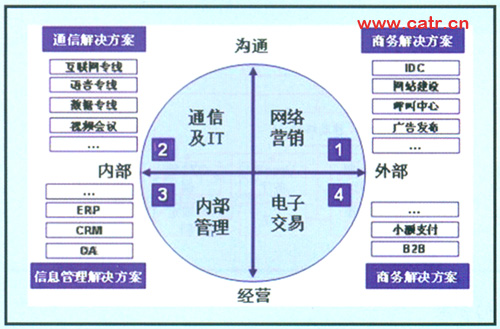 企業(yè)客戶對電信服務(wù)的需求,集中體現(xiàn)為實(shí)現(xiàn)企業(yè)商業(yè)過程的綜合通信信息整體服務(wù),具體可以按縱向溝通、經(jīng)營和橫向內(nèi)部、外部分為四部分:內(nèi)部員工溝通、內(nèi)部經(jīng)營管理、外部客戶營銷以及產(chǎn)品銷售實(shí)現(xiàn)。與之相對應(yīng)的需求如圖2所示。