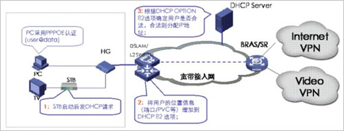 當(dāng)網(wǎng)絡(luò)設(shè)備收到STB的DHCP請(qǐng)求報(bào)文時(shí),需要在報(bào)文后添加OPTION82字段,此時(shí)有兩種模式進(jìn)行DHCP+認(rèn)證,一種是直接把DHCP報(bào)文送給DHCP服務(wù)器,由DHCP服務(wù)器根據(jù)OPT82字段來(lái)判斷該用戶(hù)是否為合法用戶(hù),從而決定是否為其分配IP地址。另一種是DHCP報(bào)文先送到BRAS,由BRAS將OPT82字段放到RADIUS的一個(gè)子域里,通過(guò)RADIUS服務(wù)器來(lái)進(jìn)行用戶(hù)合法性認(rèn)證,若用戶(hù)合法,再由DHCP服務(wù)器分配IP地址。