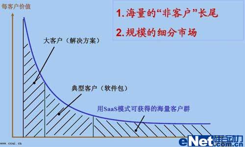 SaaS模式就是不論是什么樣的客戶都向其提供服務(wù),不論服務(wù)的時(shí)間長短,不論身處何地。傳統(tǒng)軟件是很難適應(yīng)普通客戶的,普通客戶付不出更多的投資,也不想軟件、硬件、服務(wù)都全面去投資,這樣就只有放棄使用軟件了。自然,軟件市場就少了一大群消費(fèi)者。而SaaS模式將不細(xì)分客戶類型,讓人人都可使用軟件,讓個(gè)個(gè)都消費(fèi)得起軟件?上攵@是一個(gè)怎么龐大的市場。如下圖所示: