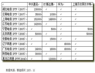在IPTV設(shè)備供應(yīng)商中,各家廠商各有千秋,其中在國(guó)內(nèi)市場(chǎng)占有率最好的是中興通訊,其次是UT斯達(dá)康、華為、上海貝爾阿爾卡特。中興通訊跟華為均能提供端到端的解決方案,從頭端到客戶端,從業(yè)務(wù)層到傳輸層,提供完整的設(shè)備,可以使用統(tǒng)一的平臺(tái)對(duì)整個(gè)系統(tǒng)進(jìn)行管理,并且在保證統(tǒng)一的同還提供了較好的開(kāi)放性,支持多家內(nèi)容提供商及STB的接入。