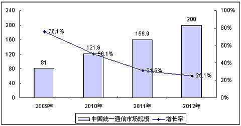 賽迪顧問預(yù)測,伴隨著全球經(jīng)濟(jì)的逐漸復(fù)蘇和企業(yè)對統(tǒng)一通信產(chǎn)品認(rèn)識(shí)與需求的持續(xù)增長,2009年中國統(tǒng)一通信市場將出現(xiàn)加速增長的趨勢,全年市場規(guī)模將達(dá)81億元,同比增長76.1%,至2012年,中國統(tǒng)一通信整體市場規(guī)模將達(dá)200億元,平均年增長率超過30%。