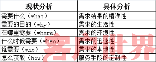 明辨客戶(hù)需求,是提升客戶(hù)體驗(yàn)的基礎(chǔ)。目前很多語(yǔ)音搜索號(hào)碼大多根據(jù)客戶(hù)對(duì)業(yè)務(wù)需求的不同,推出了不同的專(zhuān)業(yè)延伸服務(wù),并取得了很好的成效。由于使用移動(dòng)語(yǔ)音搜索的客戶(hù)在使用搜索時(shí)的環(huán)境、時(shí)間、地點(diǎn)有所不同,我們需要結(jié)合這些要素,對(duì)客戶(hù)需求進(jìn)行深入分析,以保證呼叫中心能夠提供更好的客戶(hù)體驗(yàn)。下文將采用5W1H分析法,對(duì)移動(dòng)語(yǔ)音搜索時(shí)客戶(hù)需求的特點(diǎn)進(jìn)行分析。