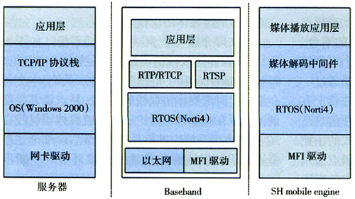 軟件平臺:SH-7300實時操作系統(tǒng)(Norti4),MPEG-4audio/videoencoder/decodermiddleware,流媒體協(xié)議棧(如圖2所示)。