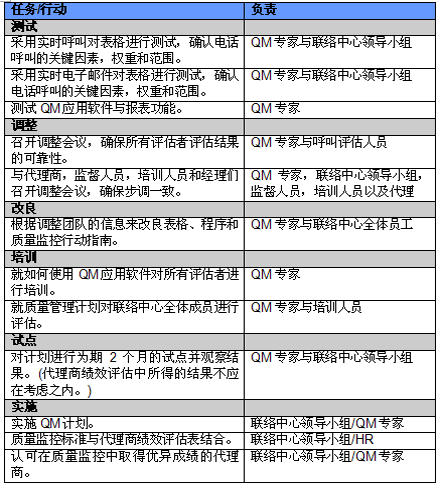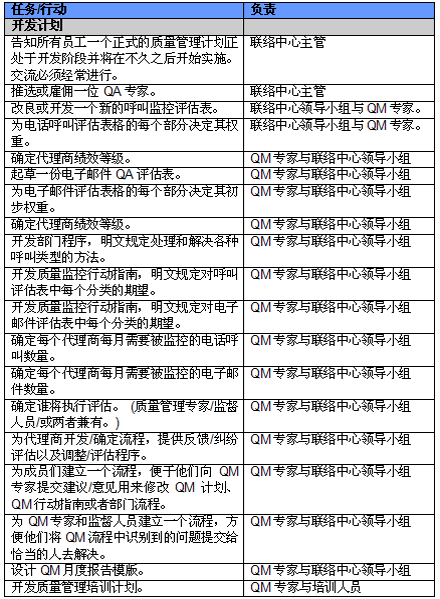 4. 開展項目交流。管理人員必須就新的或者修繕后的QM計劃與代理商進行交流。QM的成功與否與代理商的合作密不可分,如果代理商受邀參與新QM計劃的開發(fā)并且所有改變都在雙方之間明確交流過,那么成功的機會也將大大提高。交流的內(nèi)容應(yīng)包括為什么要開發(fā)這樣一個計劃,它的作用和職責(zé)是什么,它對代理商會產(chǎn)生哪些影響(對于他們的評估和提升)以及它能帶來哪些好處。幫助代理商認識到QM計劃積極的一面很重要,因為只有這樣才能讓他們看到QM不僅僅是管理人員用來告訴他們做錯了事情的一種手段。讓聯(lián)絡(luò)中心全體員工參與QM計劃的開發(fā)能夠建立他們對該計劃的支持,提高接受度的同時避免不知所措。這對聯(lián)絡(luò)中心剛剛嶄露頭角,QM計劃還未全面鋪開的中國市場而言尤為重要。