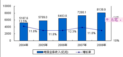 圖1 2004-2008年中國電信業(yè)務(wù)收入及增長情況