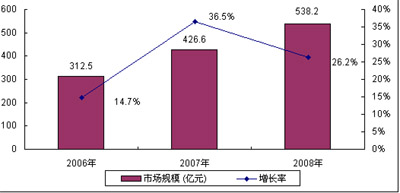 圖3 2006-2008年中國通信設(shè)備市場規(guī)模及增長
