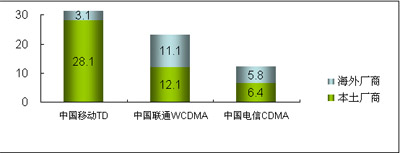 在3G設(shè)備市場方面,2008年,中國的WCDMA、CDMA2000與TD-SCDMA三種3G網(wǎng)絡(luò)在建設(shè)上有不同的進(jìn)展。中國移動啟動了第二階段的TD-SCDMA網(wǎng)絡(luò)建設(shè)、中國電信啟動了涉及面向81個重點城市的CDMA全網(wǎng)招標(biāo)、而中國聯(lián)通也開始7個城市建立WCDMA試驗網(wǎng)絡(luò)的建設(shè)工作。而在所有的網(wǎng)絡(luò)建設(shè)中,中國本土廠商借3G契機(jī)迅速提升競爭力,占據(jù)了3G網(wǎng)絡(luò)建設(shè)大部分市場份額。
