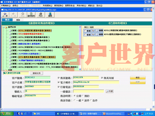 客戶服務(wù)中心經(jīng)常需要以書面的窗口或文件與客戶往來(lái),過(guò)去我們并未將這些窗口、文件電子化和自動(dòng)化,客服人員為送收文件需要離開座席去操作傳真機(jī),不僅浪費(fèi)時(shí)間(來(lái)回操作一次約需2~3分鐘)。而我們發(fā)展「EFE輕松傳e化平臺(tái)」計(jì)劃,就是將傳真、電子郵件和SMS(簡(jiǎn)訊)三種功能整合為一個(gè)e化的客戶互動(dòng)平臺(tái)。
