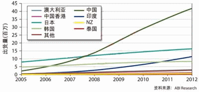 圖1:根據(jù)國(guó)家和地區(qū)細(xì)分的2005年到2012年亞太區(qū)家庭網(wǎng)絡(luò)發(fā)展趨勢(shì)