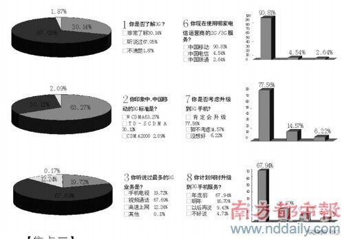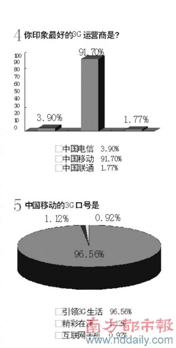 1、中國移動(dòng)的3G口號是?超過98%的被訪者選擇了“引領(lǐng)3G生活”這一正確選項(xiàng)。2、你是否考慮升級到3G手機(jī)?選擇“會(huì)升級”的接近80%。如果考慮升級到3G手機(jī),你最想使用哪家運(yùn)營商的服務(wù)?中國移動(dòng)奪得了超過九成的選票。但當(dāng)最后問到,“你印象中,中國移動(dòng)的3G標(biāo)準(zhǔn)是?”時(shí),正確選項(xiàng)T D -SCD M A的得票率竟只有三成左右。