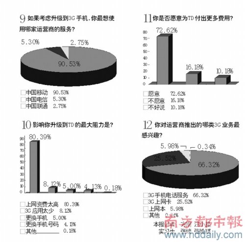 調(diào)查數(shù)據(jù)還顯示,68%的用戶希望今年年底就能升級到3G。在用戶升級阻力中,80%來自于對資費(fèi)過高的擔(dān)心,其次是擔(dān)心應(yīng)用太少,占8%;阻力來自于更換手機(jī)和更換手機(jī)號碼的只有5%和4%。