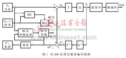 Abstraction Layer),負(fù)責(zé)對數(shù)據(jù)進(jìn)行打包和傳送。H.264編碼圖像通常分為三種類型:I幀、P幀、B幀。I幀為幀內(nèi)編碼幀,其編碼不依賴于已編碼的圖像數(shù)據(jù)。P幀為前向預(yù)測幀,B幀為雙向預(yù)測幀,編碼時都需要根據(jù)參考幀進(jìn)行運(yùn)動估計。同時,H.264在提高圖像傳輸容錯性方面做了大量工作,重新定義了適于圖像的結(jié)構(gòu)劃分。在編碼時,圖像幀各部分被劃分到多個Slice結(jié)構(gòu)中,每個Slice都可以被獨(dú)立編碼,不受其他部分影響。Slice由圖像最基本的結(jié)構(gòu)——宏塊組成,每個宏塊包含一個16×16的亮度塊和兩個8×8的色度塊。H.264標(biāo)準(zhǔn)的整體編碼框圖如圖1所示。編碼過程中,原始數(shù)據(jù)進(jìn)入編碼器后,當(dāng)采用幀內(nèi)編碼時,首先選擇相應(yīng)的幀內(nèi)預(yù)測模式進(jìn)行幀內(nèi)預(yù)測,隨后對實際值和預(yù)測值之間的差值進(jìn)行變換、量化和嫡編碼,同時編碼后的碼流經(jīng)過反量化和反變換之后重構(gòu)預(yù)測殘差圖像,再與預(yù)測值相加得出重構(gòu)幀,得出的結(jié)果經(jīng)過去塊濾波器平滑后送入幀存儲器。采用幀間編碼時,輸入的圖像塊首先在參考幀中進(jìn)行運(yùn)動估計,得到運(yùn)動矢量。運(yùn)動估計后的殘差圖像經(jīng)整數(shù)變換、量化和嫡編碼后與運(yùn)動矢量一起送入信道傳輸。同時另一路碼流以相同的方式重構(gòu)后,經(jīng)去塊濾波后送入幀存儲器作為下一幀編碼的參考圖像。