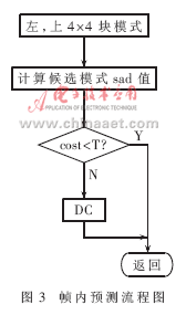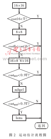 (4)算法替代和改進(jìn)。幀間預(yù)測的改進(jìn):關(guān)于算法的改進(jìn)主要集中在對me(motion estimation)的改進(jìn)上,流程如圖2所示。costmin1=min(cost16,cost8,cost16×8,cost8×16),costmin2=min(costmin1,costsub),依次在16×16、8×8、16×8和8×16大小宏塊的整像素位置做預(yù)測,再做次像素估計和幀內(nèi)預(yù)測,選用匹配準(zhǔn)則函數(shù)(采用sad作為匹配準(zhǔn)則函數(shù))取得最小值的模式進(jìn)行編碼。每計算一種模式,都將sad值與一個經(jīng)驗閥值做比較。當(dāng)sad值小于這個閥值時,立即結(jié)束運(yùn)動估計,從而減少運(yùn)算量。