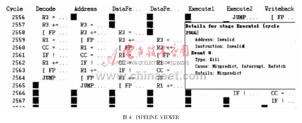 VIEWER工具,如圖4所示。在編寫完成匯編代碼后,可使用該工具觀察運(yùn)行時流水線的情況。如果有stall等出現(xiàn),會給出原因,優(yōu)化人員根據(jù)工具分析結(jié)果重新更改代碼,提高執(zhí)行效率。