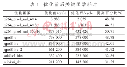 采用以上優(yōu)化方法對編碼關(guān)鍵函數(shù)進(jìn)行優(yōu)化,優(yōu)化前后函數(shù)耗時如表1所示?梢,以上優(yōu)化方法能大幅度減少編碼時間。