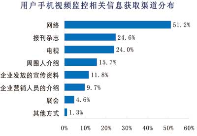 另一方面,運(yùn)營商的宣傳不到位。從諾達(dá)咨詢調(diào)查數(shù)據(jù)來看,用戶目前獲得手機(jī)視頻監(jiān)控相關(guān)信息的主要渠道是互聯(lián)網(wǎng),有51%的用戶是通過互聯(lián)網(wǎng)了解手機(jī)視頻監(jiān)控的,而從傳統(tǒng)的電視媒體和報刊雜志獲得相關(guān)信息的用戶僅僅約各占24%,通過相關(guān)手機(jī)視頻監(jiān)控企業(yè)發(fā)放宣傳資料和介紹獲取相關(guān)信息的用戶各占12%和10%。由此可見,手機(jī)視頻監(jiān)控的宣傳尚不到位,導(dǎo)致消費(fèi)者不能通過多方渠道獲取相關(guān)信息。