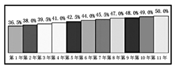除了分檔包月的語音套餐,KDDI還根據(jù)消費(fèi)者的不同需求提供了多樣折扣優(yōu)惠,其中包括在網(wǎng)時長優(yōu)惠、家庭優(yōu)惠、個人優(yōu)惠、學(xué)生優(yōu)惠等多種方式(圖1)。多樣優(yōu)惠折扣方式之間也可以通過組合產(chǎn)生新的優(yōu)惠折扣內(nèi)容。例如:在網(wǎng)時長優(yōu)惠與家庭優(yōu)惠共享的套餐在入網(wǎng)的第1年優(yōu)惠折扣達(dá)到40%,此后每續(xù)約1年將增加1%的折扣優(yōu)惠,逐年累積下來,在第11年將享受高達(dá)50%的優(yōu)惠折扣(圖2)。時段優(yōu)惠套餐中體現(xiàn)分時段優(yōu)惠,區(qū)分忙時、閑時,周末時間和工作時間,分別定價。例如,同樣是9500日元的套餐檔次,在時段優(yōu)惠套餐中,周末白天(閑時)的資費(fèi)是每分鐘10日元,而在非時段優(yōu)惠的普通套餐中,每分鐘的資費(fèi)是24日元,可見在網(wǎng)絡(luò)閑時可以享受更多的資費(fèi)優(yōu)惠。而針對學(xué)生和老人設(shè)計(jì)的套餐也能享受比普通套餐更優(yōu)惠的資費(fèi),這就體現(xiàn)了區(qū)別細(xì)分市場的差異化定價。
