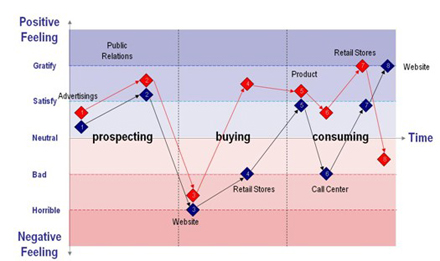 看一看“情感曲線”也許你就會頓悟。此處所示的兩條曲線來自兩個國際銀行。請注意曲線的不同之處。紅線所示的銀行與藍(lán)線所示的銀行相比在呼叫中心服務(wù)和店內(nèi)體驗上都要略勝一籌。而藍(lán)線所示銀行在網(wǎng)上銀行這一項上表現(xiàn)更好!凹t線”銀行的競爭資本是其卓越的客戶互動體驗,無論是分行的面對面互動還是來自聯(lián)絡(luò)中心的遠(yuǎn)程體驗都屬一流。
