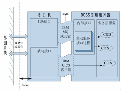 由圖1可知,從調(diào)用方向的角度看,接口可分為主動(dòng)接口和被動(dòng)接口,分別表示BOSS調(diào)用外圍系統(tǒng)服務(wù),以及外圍系統(tǒng)調(diào)用BOSS服務(wù)。主動(dòng)接口由BOSS應(yīng)用服務(wù)器驅(qū)動(dòng),即BOSS應(yīng)用服務(wù)器上的主動(dòng)服務(wù)接口進(jìn)程,是調(diào)用CICS對(duì)相關(guān)待處理表進(jìn)行輪詢(xún),并將每一條記錄封裝為一條消息放入MQ隊(duì)列(該隊(duì)列均由消息組成),接口機(jī)上的主動(dòng)接口再?gòu)年?duì)列中取出消息進(jìn)行解析,進(jìn)而根據(jù)控制信息發(fā)送到指定系統(tǒng)執(zhí)行。被動(dòng)接口則是由外圍系統(tǒng)驅(qū)動(dòng),通過(guò)接口機(jī)上的CICS客戶(hù)端調(diào)用BOSS應(yīng)用服務(wù)器上的業(yè)務(wù)層服務(wù)操作數(shù)據(jù)庫(kù)。